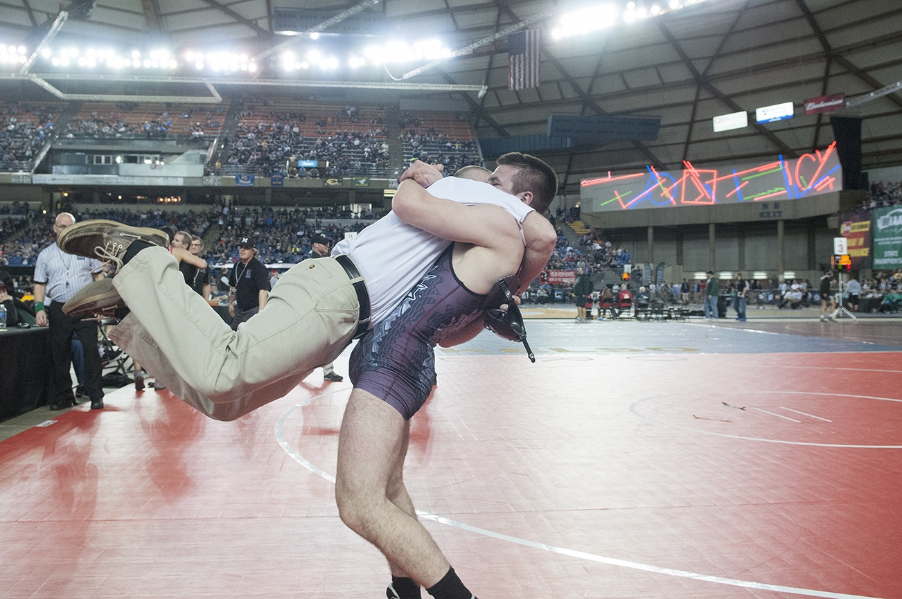 After the two somersaults on the mat to celebrate each title and before he was handed a can of Mountain Dew Voltage to enjoy for each title, Cain shared a moment with his father, Montesano assistant coach Darold Cain. The two embraced with Austin picking Darold up off the ground.